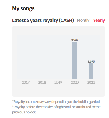 아 저작권으로 얻은 수익을 안 적어서 캡쳐해서 덧붙이자면...총 6곡으로