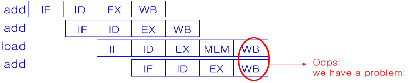 - 하드웨어가 여러 명령들의 수행을 지원하지 않기 때문에 발생, 자원충돌(Resource Conflicts)