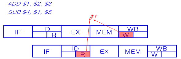 | Operand forwarding | - 레지스터 파일에 반영되기 전에 수행(EX) 단계에서 계산된 결과를 다음 인스트럭션의 수행단계로 전달하는 방법 |