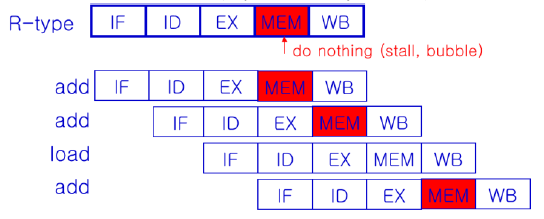 - 해당 기능을 사용할 수 있을 때까지 지연(Pipeline stall, bubble)