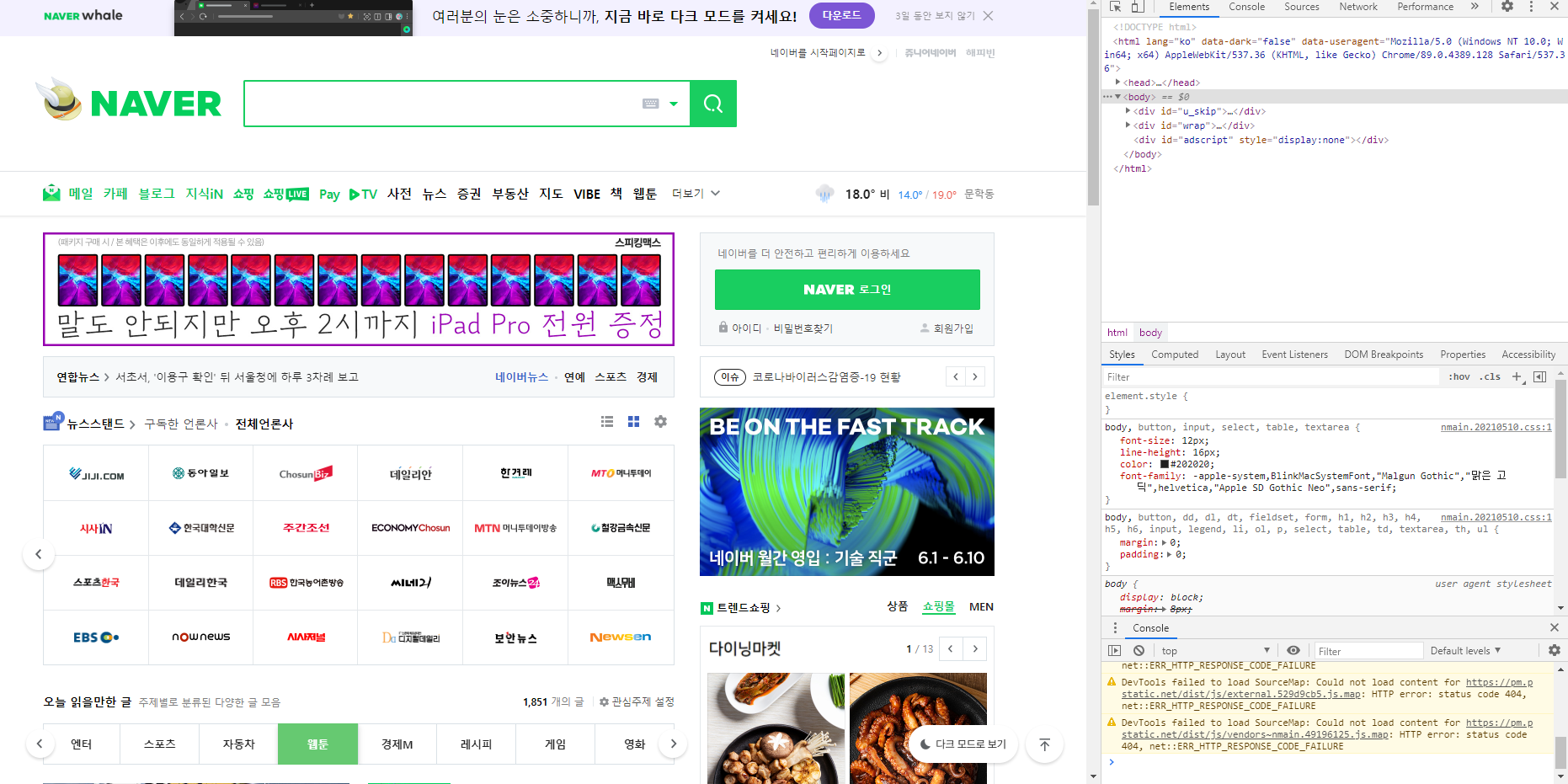 우선 브라우저(크롬)을 켜고 아무 사이트나 들어간 후, F12를 눌러서 개발자모드를 켠다.