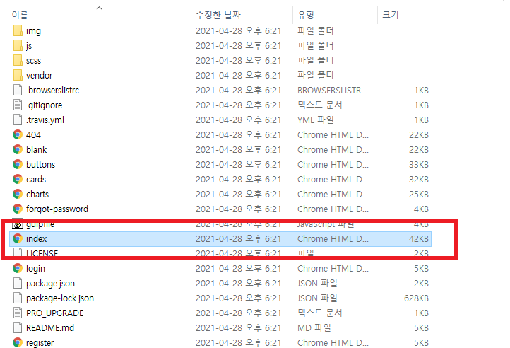 압축을 풀었으면 위와 같이 index 페이지를 열어서 SB Admin 2의 구조를 파악해본다.