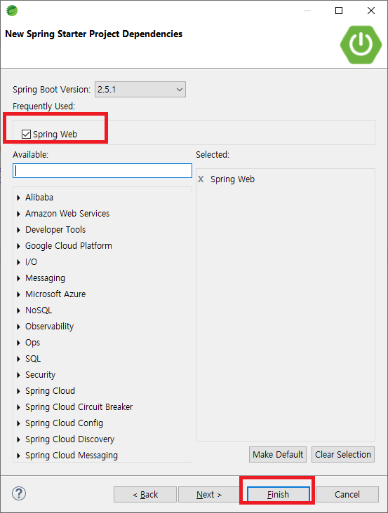 Spring Web만 디펜던시로 추가 한후 Finish를 선택하여 프로젝트를 세팅한다.