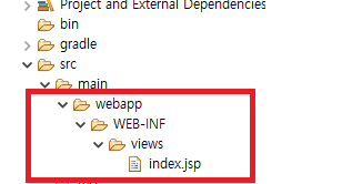 main 폴더 밑에 webapp과 WEB-INF, views 폴더를 생성하고 거기에 index.html을 옮긴 후 확장자를 jsp로 변경한다.