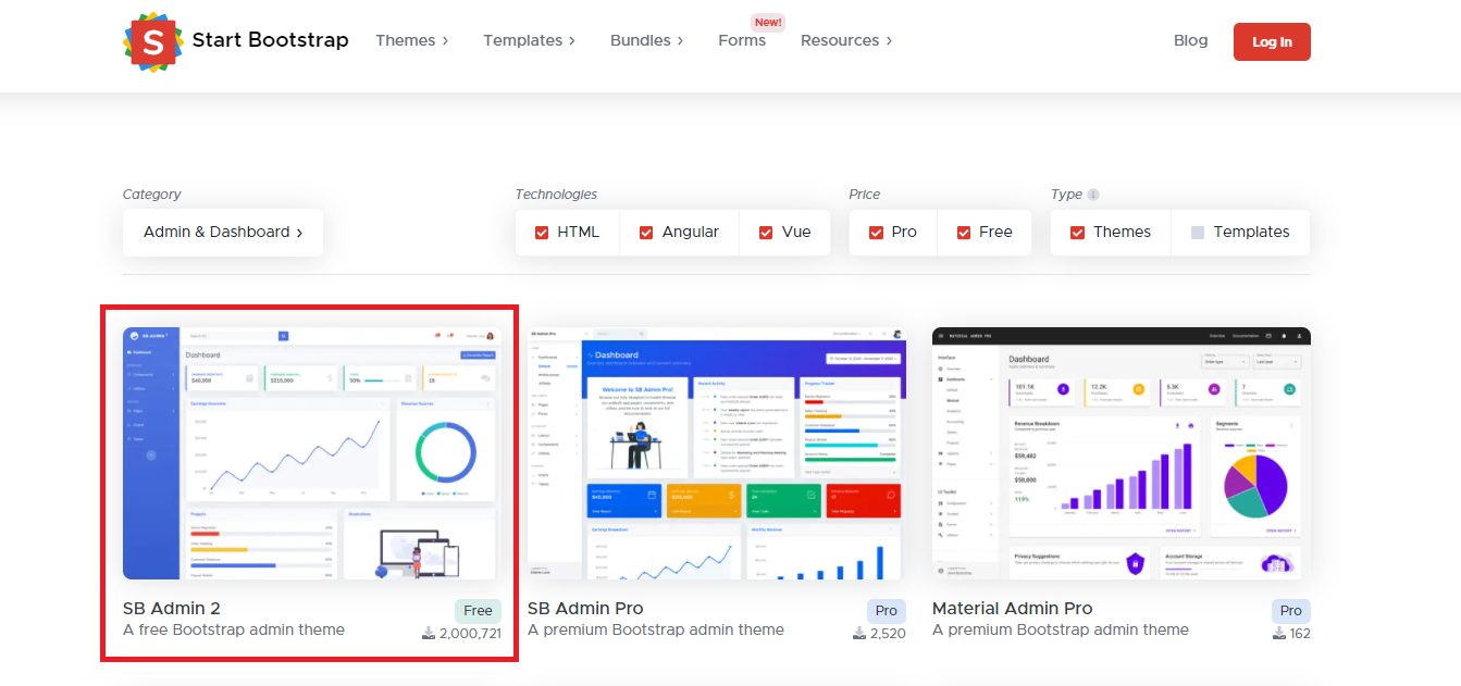 부트스트랩의 관리자 페이지로 대표되는 것은 SB Admin이며, SB Admin 2 무료 버전을 받고 진행한다. 위 사이트는 아래의 링크로 들어가면 된다.