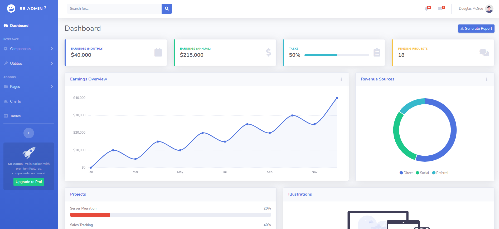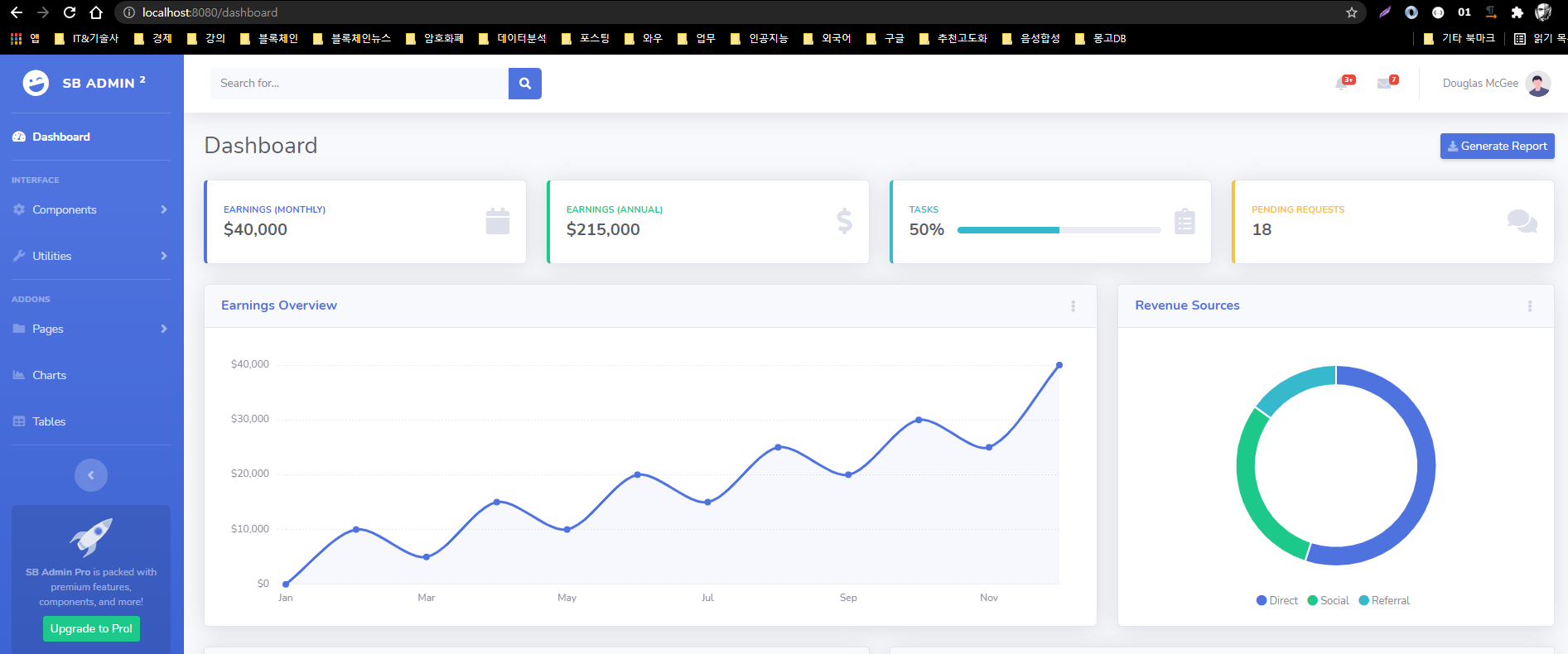 브라우저에 위 경로를 입력하게 되면 아래처럼 SB Admin 대시보드가 화면에 나오는 것을 확인할 수 있다. 대시보드가 세팅되었다면 앞으로 페이지 개발을 진행하면 된다. 참고로 개발을 할 때 우선 기능별로 페이지를 쪼개고 작업을 하는 것이 유리하다.