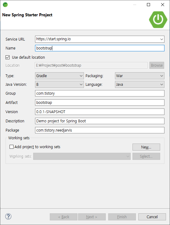java version, type 등등 스프링부트를 설정한 후 Next를 눌러 디펜던시를 설정한다
