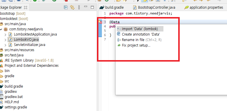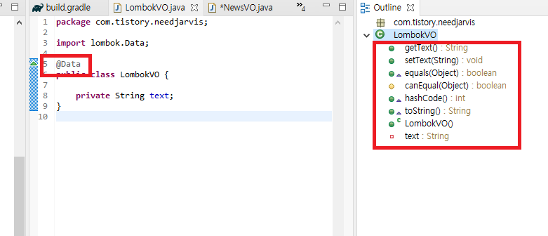 그레이들이나 메이븐으로 라이브러리를 정상적으로 다운로드 했다면, Import lombok.Data를 import 할 수 있게 되는데 롬복이 정상적으로 작동되고 있는지는 이클립스 우측창의 outline을 확인하면 된다.
