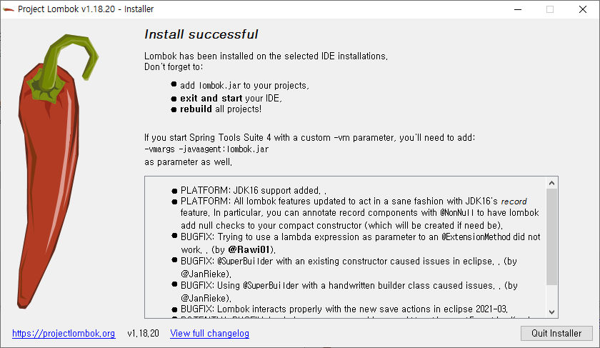 설치는 순식간에 진행되니 프로그레스바가 없다고 해서 놀랄 필요는 없다. Quit Installer를 클릭하여 인스톨 화면을 종료한 후 IDE를 재실행한다. 여기까지 설치가 완료 되었으면 이제 롬복을 적용하는 방법을 실행해본다.