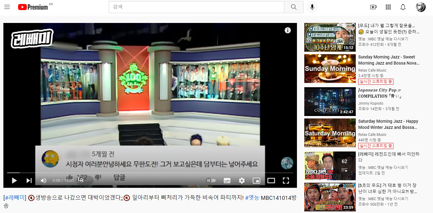 위 캡쳐 이미지는 무한도전 영상을 선택한 후 나오는 추천인데 우측의 추천 리스트를 보면, 최상단은 현재 영상과 가장 연관이 깊은 영상이 나오며, 그외 나오는 것들은 내가 구독한 채널들과 전에 검색하거나 봤던 영상들이거나 유사한 영상들이 섞여서 나온다.