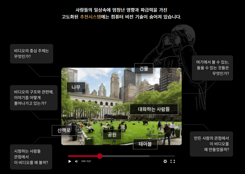 그리고 STT(Speech To Text) 기능을 활용하여, 영상에 나오는 소리를 자막으로 만들어내고 이 자막을 이용해서 내부적으로 토픽이 유사한 컨텐츠를 찾아낼 수 있다. 넷플릭스는 이 모든 것들을 컨텐츠로 등록할 때 직접 만들기에 불필요하지만, 유튜브는 불리한 추천 시스템에서 살아남기 위해서 동영상 분석 기법을 고안해낸 것이다.