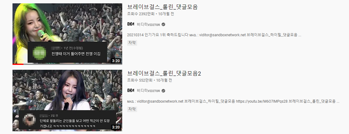 댓글을 편집하여 재미있는 영상을 올리는 어느 유튜버는 브레이브 걸스 영상을 올렸는데 이 영상이 매우 잘 만들어 지면서 유튜브를 보는 사람이라면, 어느새 자신의 추천 목록에 처음 들어보거나 익숙하지 않는 브레이브 걸스의 영상이 올라오게 되었으며 나도 모르게 클릭을 하여 영상을 보면서 영상의 인기는 기하급수적으로 터지게 되었다.