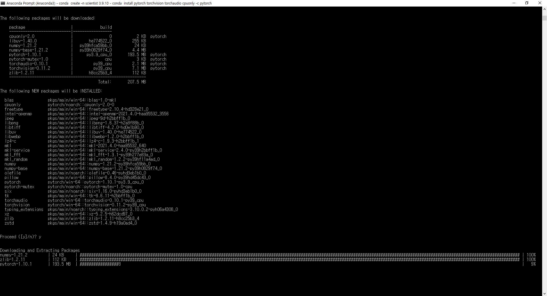 Command 명령어를 입력하게 되면, 이제 원하는 설정으로 pytorch가 설치된다.