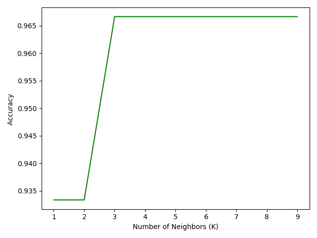 위와 같이 결과는 1~2가 동일하게 나오다가 3부터 성능이 올라갔는데 3이후부터는 값이 동일하다. 즉 여기서 최적의 knn은 3이 된다.