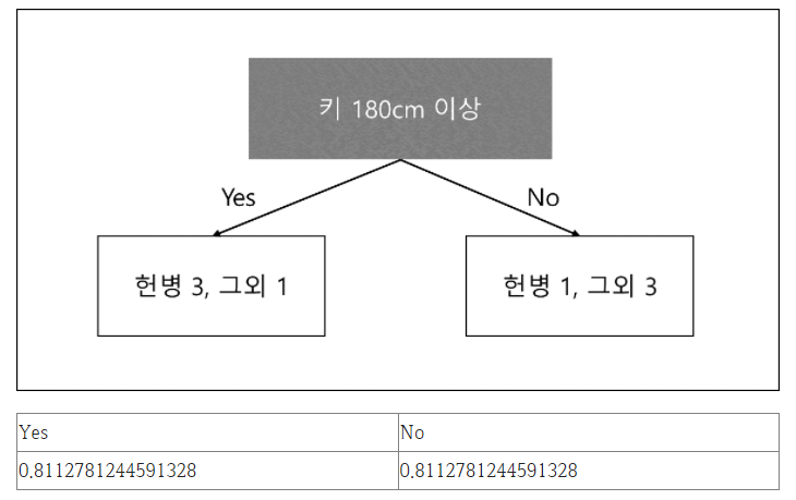 키의 경우 Yes가 4개, No가 4개였기 때문에 최종적으로 계산된 값을 각각 0.5씩 곱하여 보정한 후 합치면 정보이득 값이 된다.