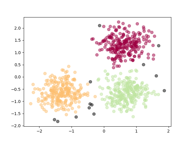 위 시각화 결과를 보면 클러스터에 멀어진 검정색 noise point들이 보일 것이다. 예를 들어, 노란색 클러스터와 초록색 클러스터 사이에 있는 point는 어느 클러스터에 속해야 할지 애매해 질 수 있는데 이럴 땐 noise point=outlier로 처리하는 것이 어떻게든 클러스터로 만드는 다른 클러스터(ex: K-means) 알고리즘과는 다른 점이다.