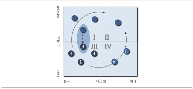 - 위 그림에서는 I 영역에 있던 분석 과제(9번)를 난이도의 조정하여, III 영역에 위치시켜, 우선순위를 조정하였음