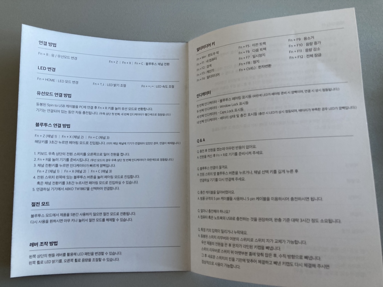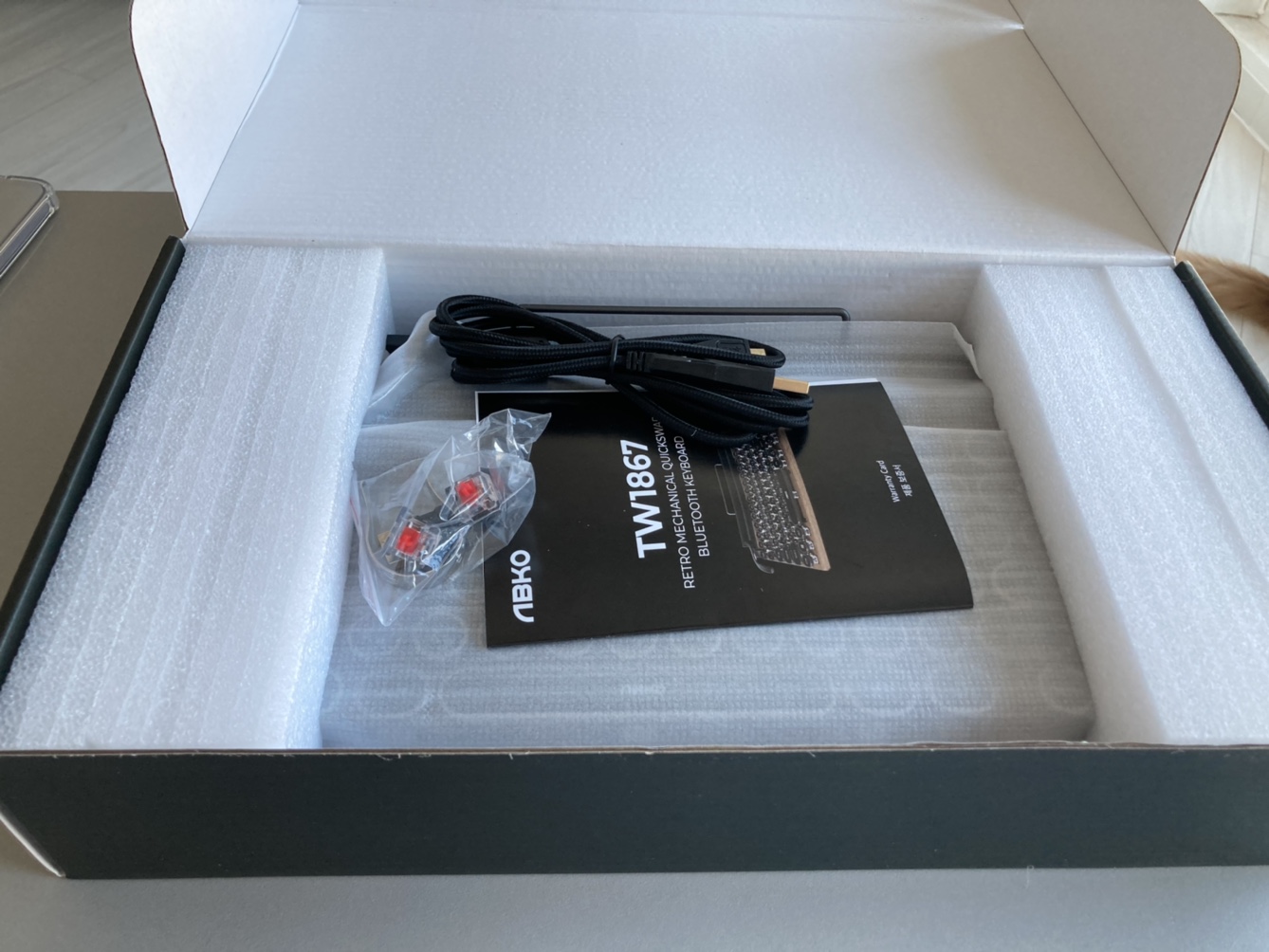 박스를 열어보면, 스페어 적축키가 있고 무선 연결이 안되는 데탑 컴퓨터를 위한 블루투스 동글이 있으며 무슨 용도인가? 싶은 모양의 5핀 usb 케이블이 있었다. 당연히 usb 케이블은 충전용이긴 한데 무슨 키보드 선처럼 두꺼웠고, 무게감이 있어서 다른 추가적인 용도가 있는가 싶었다.