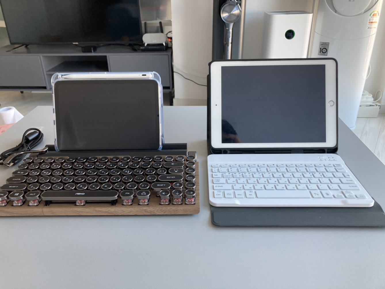 왼쪽은 아이패드 미니 6세대이고, 우측은 2018년?인가 샀던 일반 아이패드에 케이스와 같이 들어있던 블루투스 키보드이다. 우측 것도 나름 잘 쓰고 있었고 케이스와 일체 형태다보니 회사에서 회의록이나 일정 같은거 작성할 때 많이 사용했는데 이제는 그 위치를 미니와 레트로 키보드에게 넘겨야 겠다.