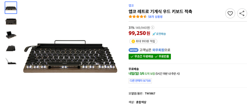 영상과 키보드의 모양이 살짝 다를 뿐 나머지 부분은 거의 유사했었기에 이것을 선택하였다. 일단 쿠팡을 하면 로켓와우병에 걸리는데 로켓 와우가 아니면 안사는 병이 있고, 가장 유명한 키보드라 일단 신뢰가 갔다. 로켓와우의 비즈니스 모델이 많이 팔리는 것을 센터에 넣는 것이니 사실 와우의 제품이 가장 신뢰가 있는건 사실이긴 했다.