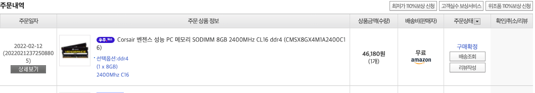 문제는 추천하는 메모리를 구입하기 위해서 사이트를 확인해봤지만 국내의 사이트 모두 품절이 된 상태였다. 포기할수가 없어서, 해당 제품의 스펙을 확인해 본 후 인터넷에 검색을 해보니 유사하고 저렴한 제품이 아마존에서 판매하고 있었고, 11번가에서 아마존 제품을 구매할 수 있기 때문에 11번가를 이용하였다.