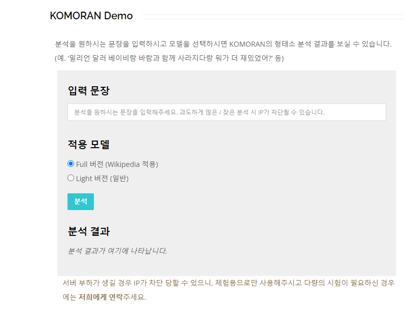 코모란 데모페이지[3]에 들어가면, 이와같이 입력 문장과 적용 모델을 선택하는 것이 나오며 문장을 입력한 후 분석 버튼을 누르게 되면 엑소브레인에 비비지는 못하더라도 높은 수준의 형태소 분석을 보여준다는 것을 알 수 있다.