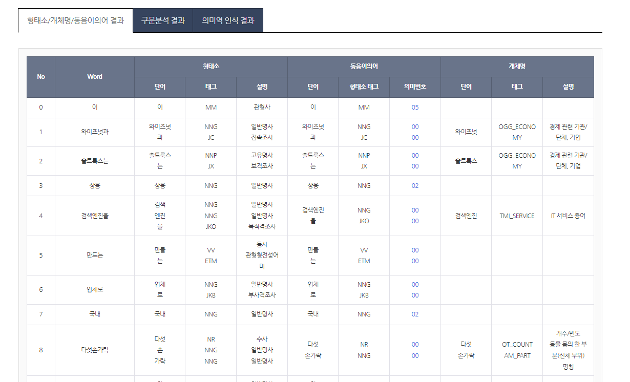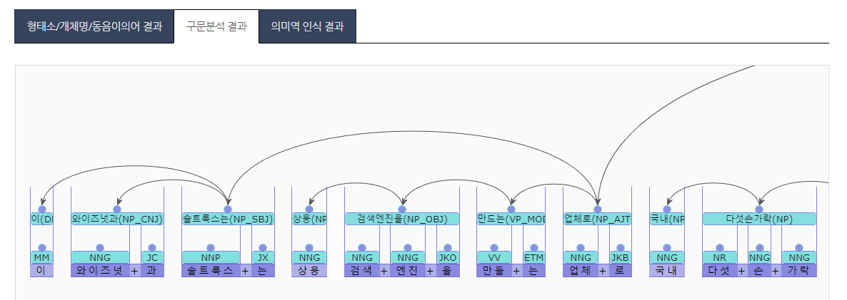 구문분석이나 의미역 인식 결과까지 보여주며 사실상 형태소 분석기의 끝판왕다운 모습을 보여준다.