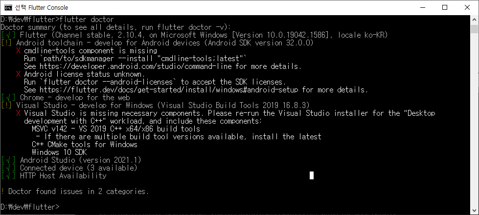플러터의 경우 doctor라는 기능을 사용하여, 플러터의 설치 문제를 해결할 수 있게 도와준다.