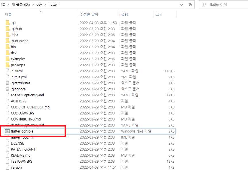 우선 플러터가 설치한 폴더로 이동을 한 후, flutter_console.bat이라는 파일을 더블클릭한다.