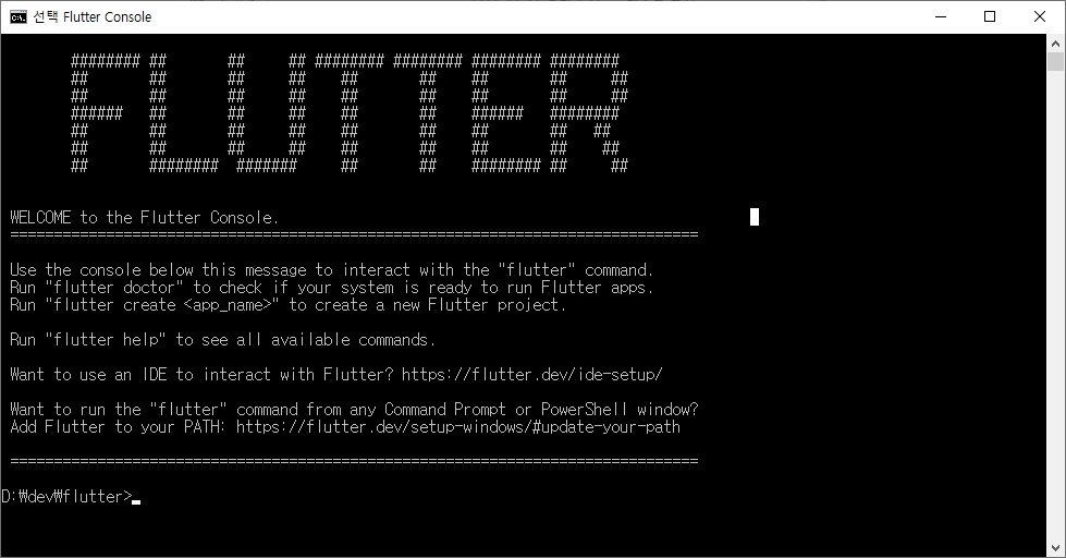 위 플러터 경로의 console을 실행하면, 콘솔창이 띄워지며 명령어를 입력할 수 있게 된다.