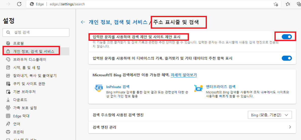 브라우저 설정 -> 개인 정보, 검색 및 서비스 -> 주소 표시줄 및 검색 -> 입력한 문자를 사용하여 검색 제안 및 사이트 제안 표시 해제
