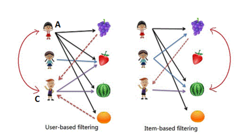 기본적으로 협업 필터링을 생각하면 많은 분들이 사용자 기반의 협업 필터링(User-Based Collaborative Filtering, UBCF)을 많이 생각하실 겁니다. 사용자 기반의 협업 필터링은 사용자들의 행동을 통해서 유사한 사용자를 찾고, 유사한 사용자가 선호한 아이템을 주는 방식입니다.