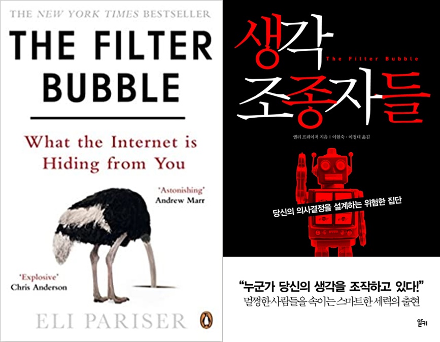 필터 버블(Filter Bubble)은 사용자의 정보(위치, 클릭, 검색 이력 등)를 통해 개인화된 결과물을 기반으로 사용자가 필터링된 정보만을 접하게 되어 마치 거품처럼 사용자를 가둬버리는 현상을 말합니다. 이 용어는 미국의 정치 참여 시민단체 '무브온'의 이사장인 엘리 프레이저(Eli pariser)의 생각 조종자들(원제 The Filter Bubble, 2011)이라는 저서에 처음 등장하였습니다.