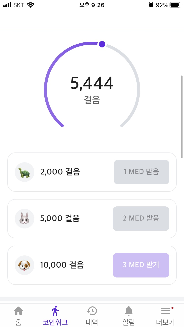 그러나 메디블록은 2천보에 1메디, 5천보에 2메디로 5천보를 걷는 순간 3메디를 받는 것이고 1만보를 걸으면 총 6메디를 받을 수 있다. 게다가 출석체크 기능까지 있는데 매일 1메디를 주게 된다.