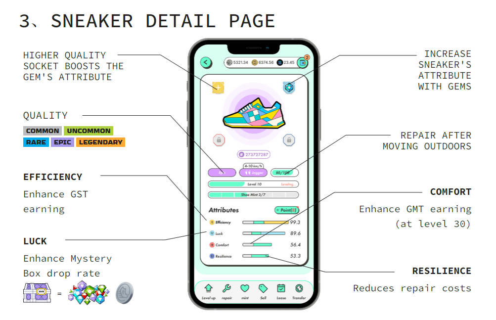 그리고 운동을 해서 얻은 GST 등으로 스니커즈를 꾸밀 수 있습니다. 보상을 늘릴 수 있거나, 회복력을 높일 수 있거나 미스터리 박스를 얻을 수 있는 확률을 올릴 수 있거나 게임 캐릭터를 강화시키는 재미를 느낄 수 있는 것이죠.