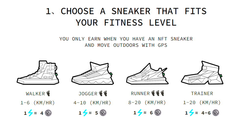 솔라나를 기반으로 스니커즈를 내 운동 수준에 맞게 구매를 합니다. 걷는 것 위주로 운동을 할 거면 워커(WALKER) 슈즈를 조깅을 하는 수준이면 조거(JOGGER)를 구매합니다. 스테픈은 기본적으로 야외에서 운동을 해야지만 수익이 발생합니다. 즉, 헬스장에서 트레드밀을 이용하거나 실내 자전거를 타더라도 수익이 발생하지 않으니 이 부분을 꼭 참고하셔야 됩니다.