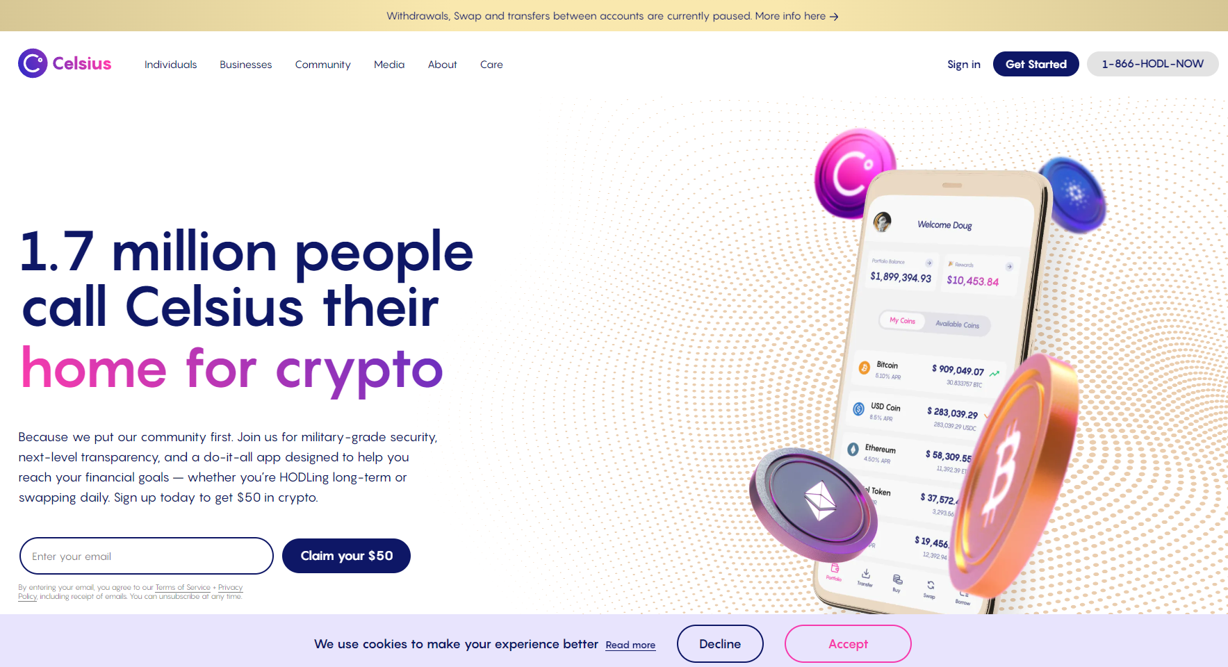 암호화폐 폭락장이 시작이 되자, 많은 이용자들이 이더리움을 인출하기 위해 셀시우스에게 인출 요청을 하였지만, 셀시우스는 이미 35000개의 ETH를 분실한 전력이 있으며 그동안 채굴 사업이나 약세장으로 인한 손실등이 겹쳐 이들의 요청을 들어줄 수 없게 되었다.