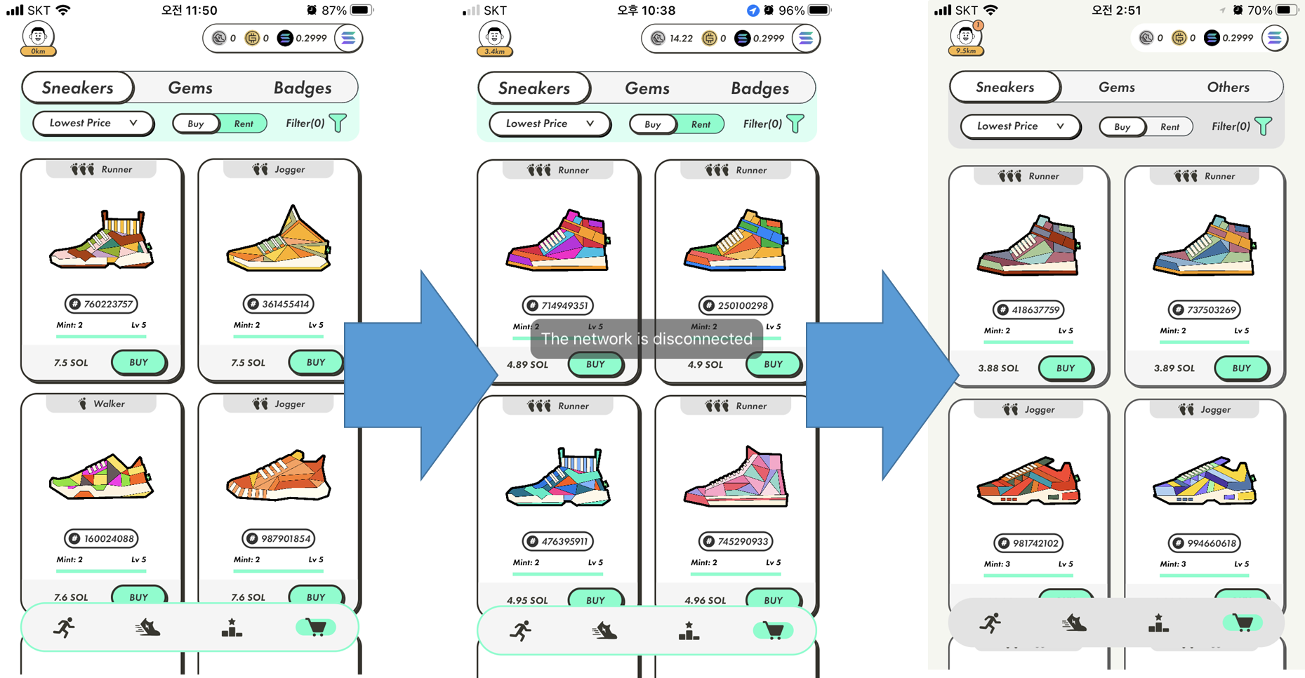 제일 왼쪽이 신발을 산 후, 다음 날의 모습 두번째가 사용한지 3일 후, 세번째는 사용한 지 9일 후의 모습입니다. 제가 처음 스테픈을 시작 했을 때 11.2 Sol에 샀는데 당시 솔라나가 약 55000원 정도 했었으니 약 60만원 정도에 매수를 한 것이죠. 나름 싸게 샀다고 생각했는데 에너지를 채우고 있는 다음날에 마켓을 보면서 놀라지 않을 수 없었습니다. 무려 40% 하락한 7.x 솔라나가 된 것이었죠.