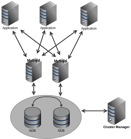 MySQL 클러스터는 관리 노드(Management Node), 데이터 노드(NDB Node), MySQL 노드로 구성되며 아래와 같은 역할을 수행한다.