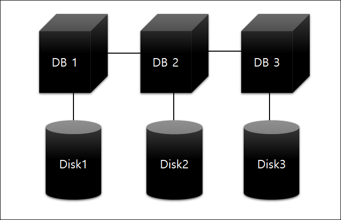 각 DB 인스턴스는 자신이 관리하는 데이터 파일을 자신의 로컬 디스크에 저장하며, 노드간 공유하지 않는다.