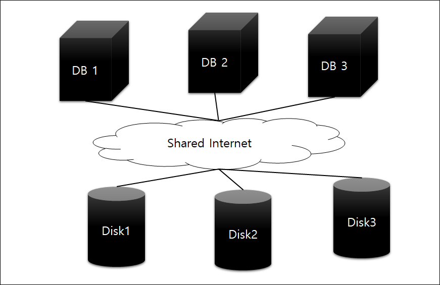 데이터를 공유하려면 SAN(Storage Area Network) 같은 공유 디스크가 필요하며, 모든 노드가 수정 가능하기에 동기화 작업을 위한 별도의 커뮤니케이션 채널 필요