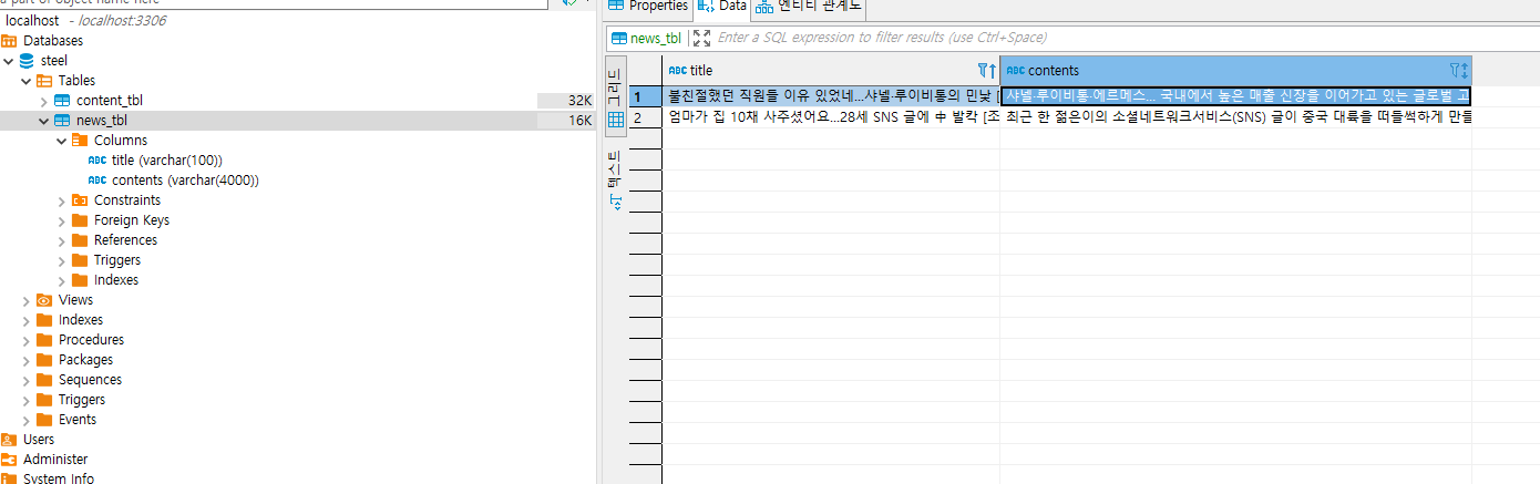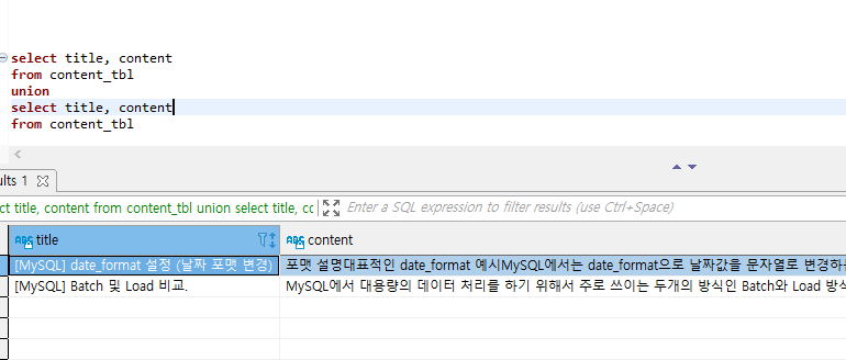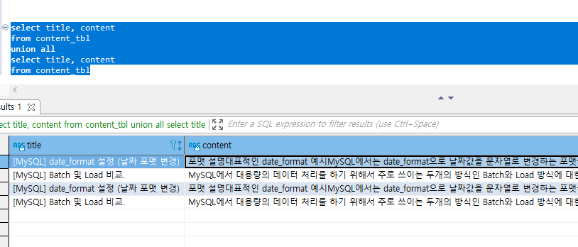 위와 실습을 위해 위와 같이 콘텐츠 테이블을 먼저 호출하였고, 두번째는 뉴스 테이블을 호출하였습니다. 여기서 둘간의 필드 타입이 동일하지는 않지만, 궁극적으로 텍스트이다보니 별다른 문제 없이 UNION이 출력되었습니다.
