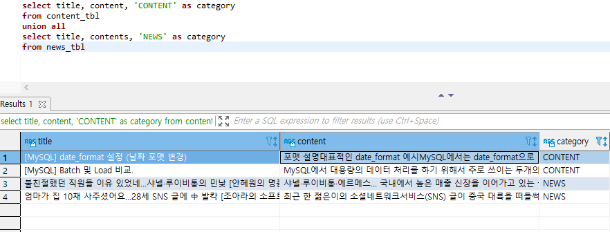 select title, content, 'CONTENT' as category