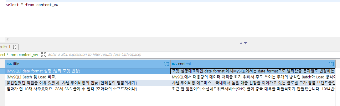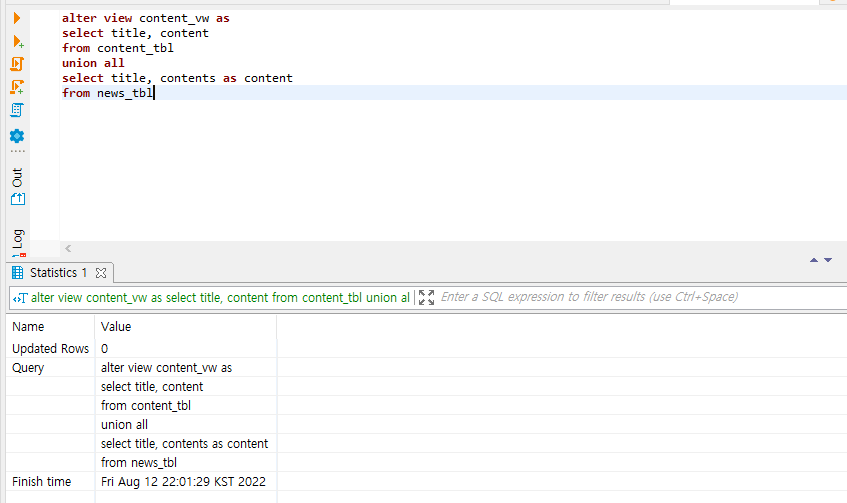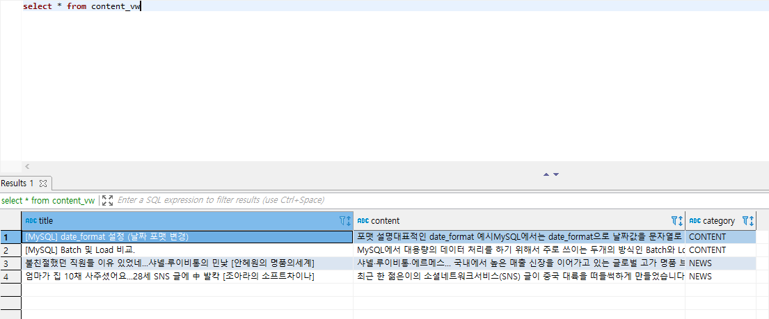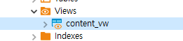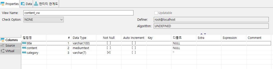 위 화면은 content_vw에서 category 컬럼을 alter로 제거한 것의 캡쳐 화면이다