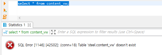 삭제가 되었는데 위와 같이 select를 날릴 시 SQL Error [1146] [42S02]: (conn=18) Table [뷰이름] doesn't exist 에러가 발생하게 된다.