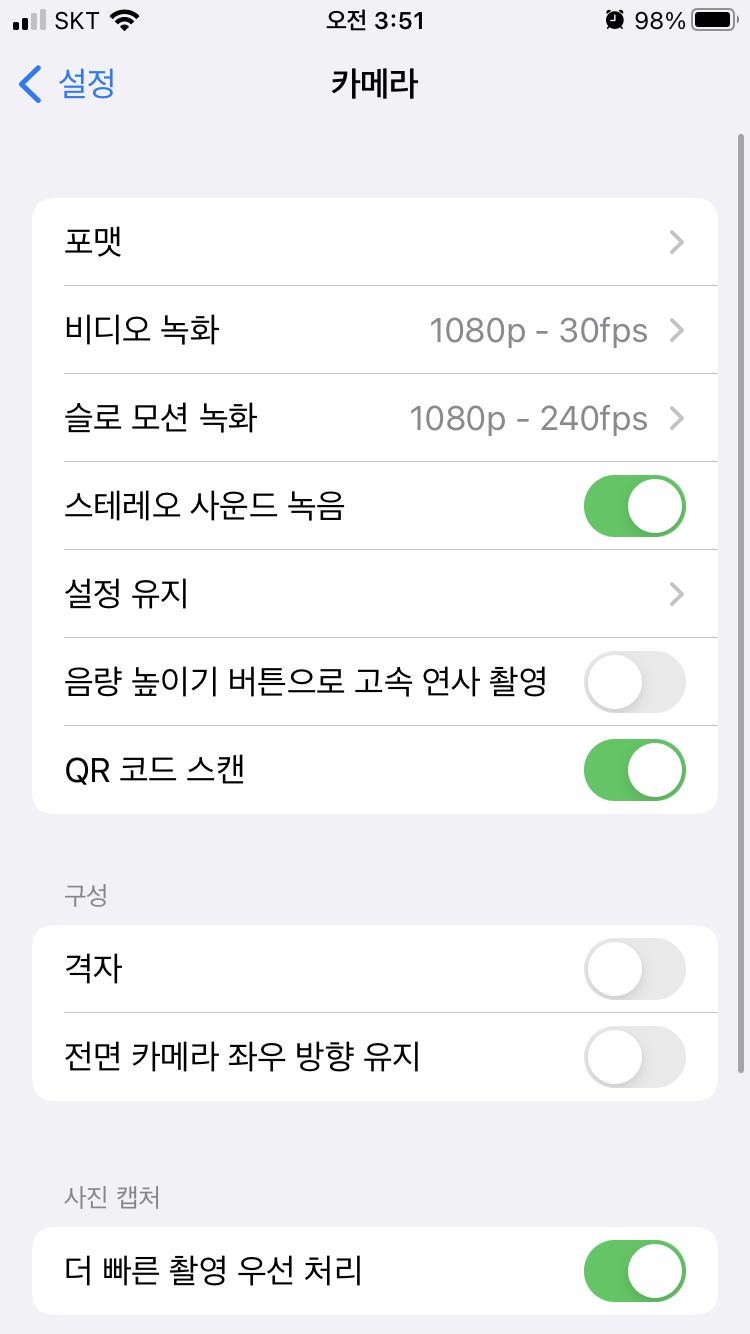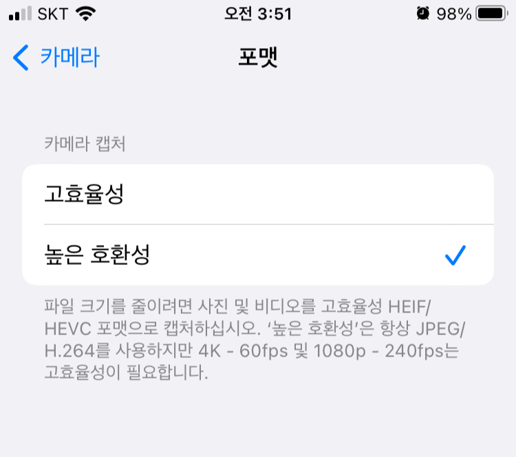 즉 저처럼 포스팅을 올리는 사람이 아니라면, 고효율성을 찍는 것이 낫겠지만 사진을 찍는 이유 중 상당수가 포스팅에 있다면 높은 호환성이 더 맞을거라 생각합니다. 사실 이 모든 것은 티스토리가 HEIF를 지원하면 되는 것인데 언제쯤 지원이 될지는 모르겠네요. 위와 같이 설정을 하였다면 이제 HEIC로 찍히지 않습니다.