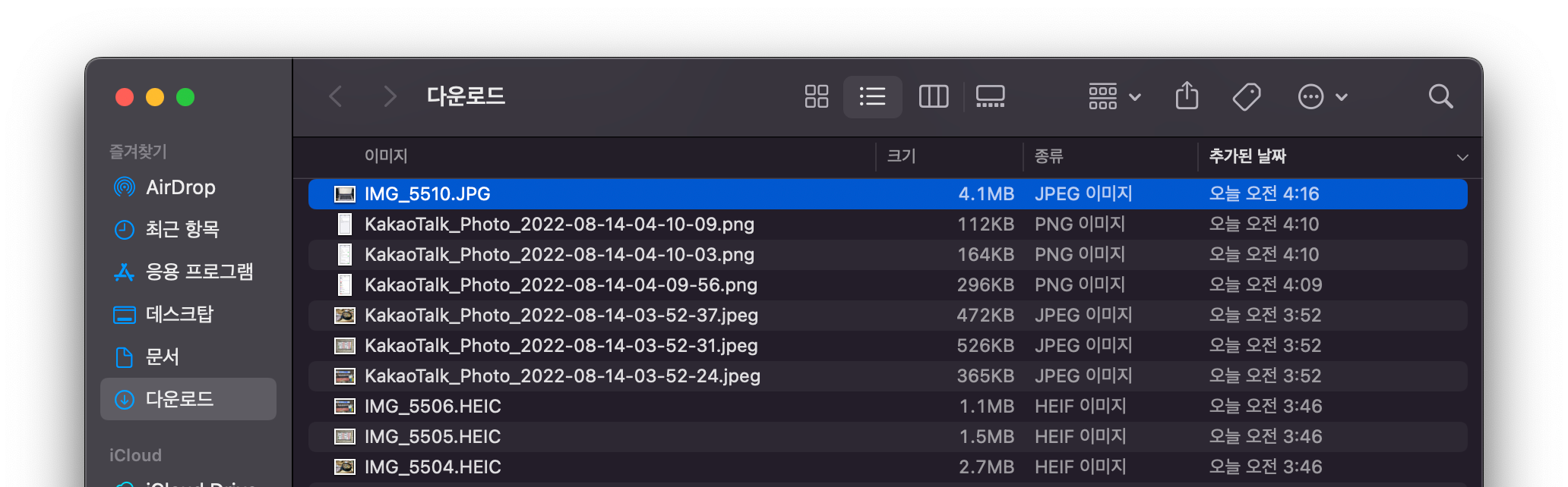 하단의 IMG_5506.HEIC 등을 보면 평균 1~2MB 정도 되는데 컴퓨터를 찍은 사진을 보면 4.1MB로 용량이 약 2~4배 늘어난 것을 확인할 수 있습니다.