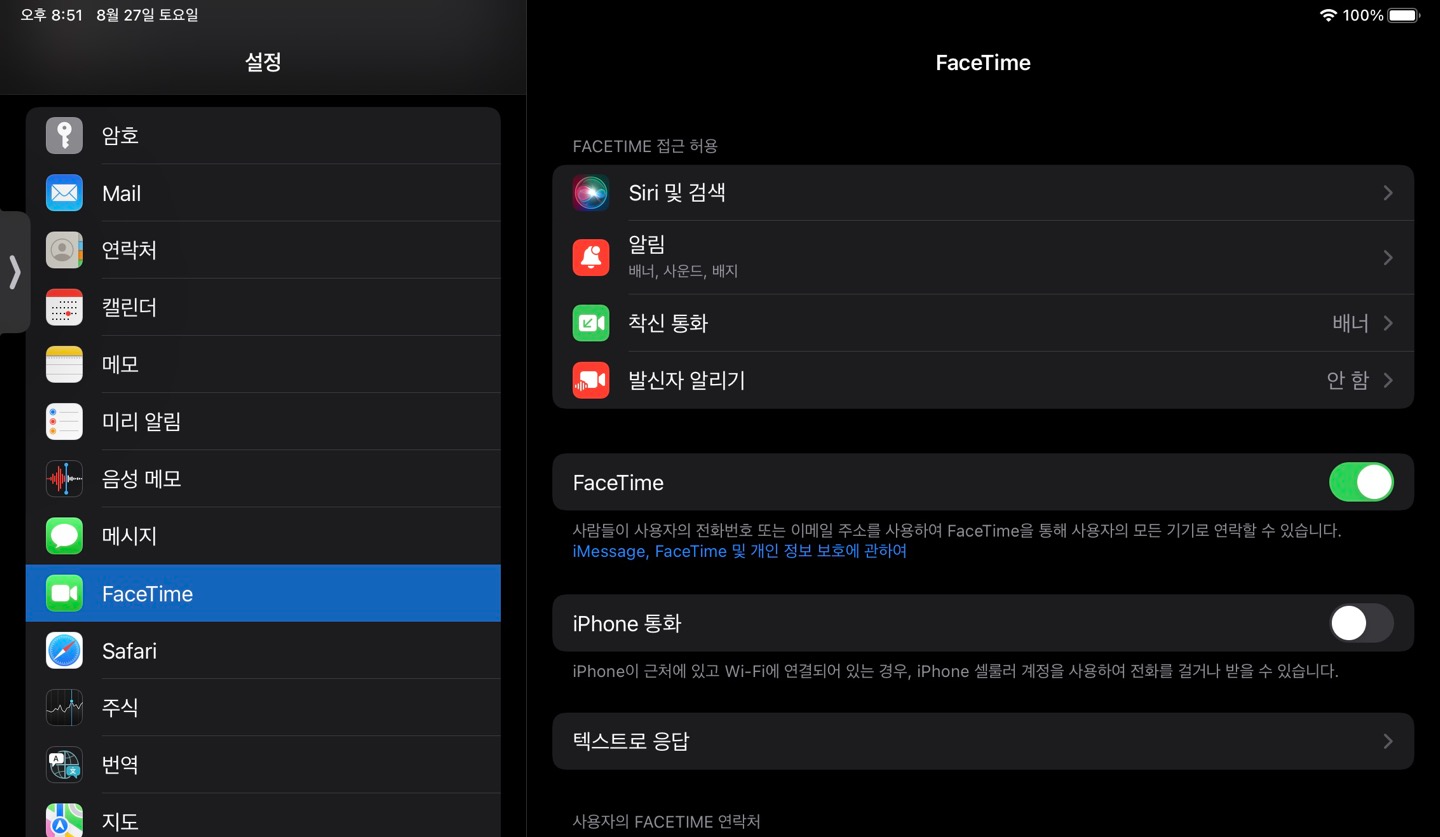 아이패드의 설정 앱을 켠 후, FaceTime 설정을 들어간다.