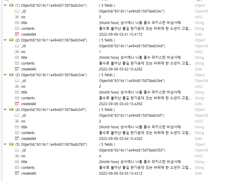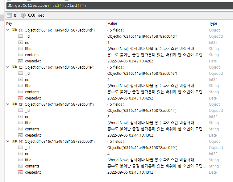 위의 코드를 실행하면 아래와 같이 5개의 데이터가 저장되었으며, no는 0~4번까지 그리고 createdAt의 값이 1분씩 차이가 나는 것을 확인할 수 있습니다.