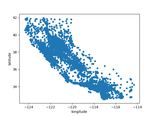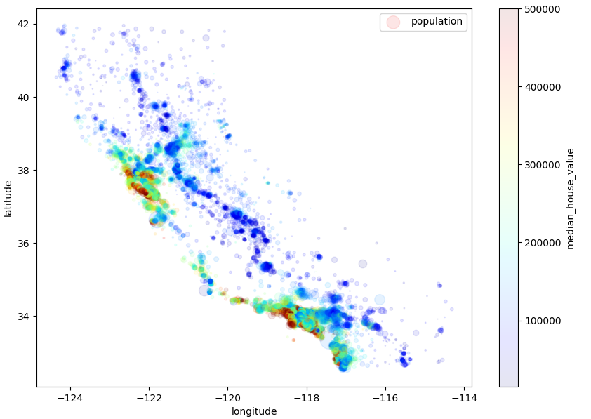 이렇게 산점도로 데이터를 설정하게 되면, 캘리포니아 지역의 경우 해안가에 가까울수록 가격이 비싸다는 것을 알 수 있으며 어느 지역에 인구가 밀집되어 있는지 한눈에 쉽게 파악할 수 있다.
